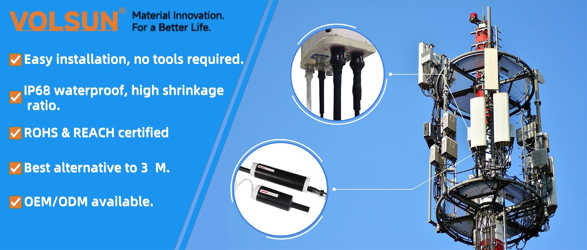 Монтажът е бърз и прост с студеносвиващата тръба от силиконова гума Volsun. За разлика от традиционните термоусукващи се тръби, които изискват топлинно оръдие или други инструменти, тази тръба използва студеносвиващ метод. Тя е предварително разширена и поставена върху премахваема основа. Когато основата се премахне, тръбата се свива плътно около кабела или контакт, създавайки здраво и сигурно уплътнение без нужда от топлина или сложни уреди. Това я прави идеална за бързи ремонти или монтаж на терен, където може да няма достъп до захранвани инструменти.