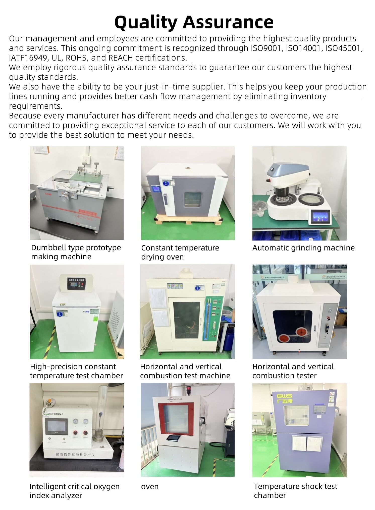 Нашите мениджъри и служители са ангажирани да предлагат продукти и услуги с най-високо качество. Този непрекъснат ангажимент е признат чрез сертификати ISO9001, ISO14001, ISO45001, IATF16949, UL, ROHS и REACH